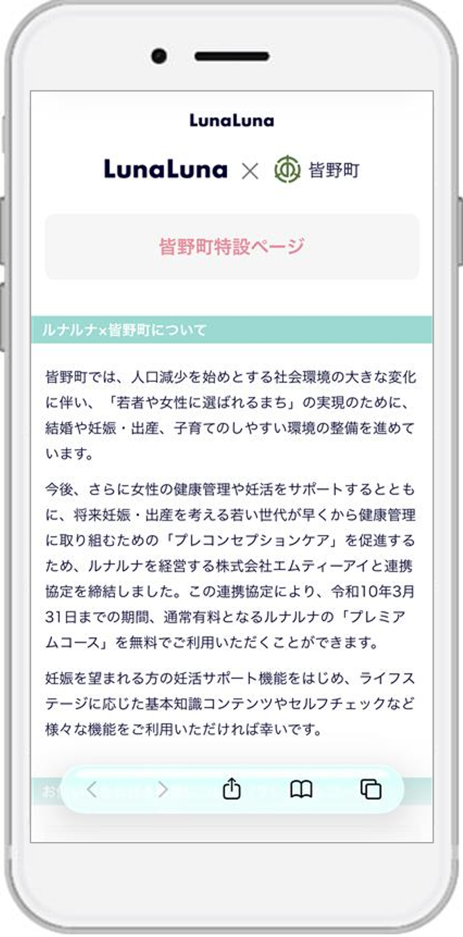 埼玉県秩父郡皆野町(町長:黒澤 栄則)と株式会社エムティーアイ(本社:東京都新宿区、代表取締役社長:前多 俊宏 以下、エムティーアイ)は、女性の健康管理等に関する支援を行うことを目的に「女性の健康管理支援に関する連携協定」を4月1日(水)に締結します。  本連携協定により、皆野町の住民に対し、エムティーアイが提供する、すべての女性の一生に寄り添うウィメンズヘルスケアサービス『ルナルナ』の有料機能である「プレミアムコース」の無償提供を4月1日(水)より開始します。『ルナルナ』のサービスを通じて、不妊治療や妊活に関する基礎知識などの情報配信も予定しており、利用者はライフステージに合わせた健康情報を受け取ることができます。  また、今回の取り組みを通じて、『ルナルナ』のアプリ提供や情報配信が家庭内での妊活に寄与できるか、検証を実施する予定です。 1.連携協定締結の背景  皆野町では、人口減少をはじめとする社会環境の変化を背景に、「若者や女性に選ばれるまち」の実現に向けて取り組んでいます。その一環として、結婚・妊娠・出産・子育てまでを切れ目なく支える環境整備を推進するとともに、若い世代が将来を見据えて早い段階から健康管理に取り組めるよう、「プレコンセプションケア」の促進も目指しています。  エムティーアイは、2000年に『ルナルナ』のサービス提供を開始しています。『ルナルナ』に蓄積されたビッグデータを活用し、独自の排卵日予測アルゴリズム※1を構築するなど、25年にわたり培ったノウハウや知見を生かして、月経管理をはじめ、妊活、妊娠、出産、育児、更年期などライフステージに合わせた女性の健康をサポートしています。  このような背景のもと、両者が相互に連携しながら女性の健康管理等の支援を行うため、今回の連携協定の締結に至りました。 2.連携・協力事項について  エムティーアイが提供する『ルナルナ』を活用し、下記事項に関して連携、協力を行います。 (1)女性の健康管理に関する正しい知識の普及啓発に関すること (2)妊娠・出産・不妊・不育に関する正しい知識の普及啓発及び支援に関すること (3)皆野町が実施する妊娠を望む夫婦に対する支援に関すること (4)エムティーアイが実施する妊娠を望む夫婦に対する支援に関すること (5)その他、双方が必要と認めること 3.取り組み内容 ■『ルナルナ』の「プレミアムコース」を無償提供 【無償提供期間】 ●...